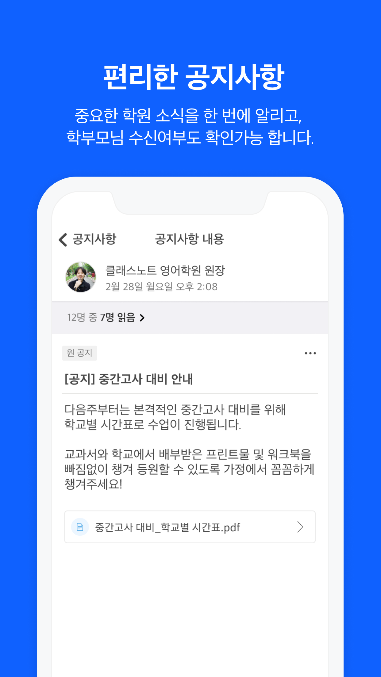학부모 몇 명이 공지사항을 읽었는지 확인할 수 있고 안내에 필요한 파일도 첨부할 수 있어요.