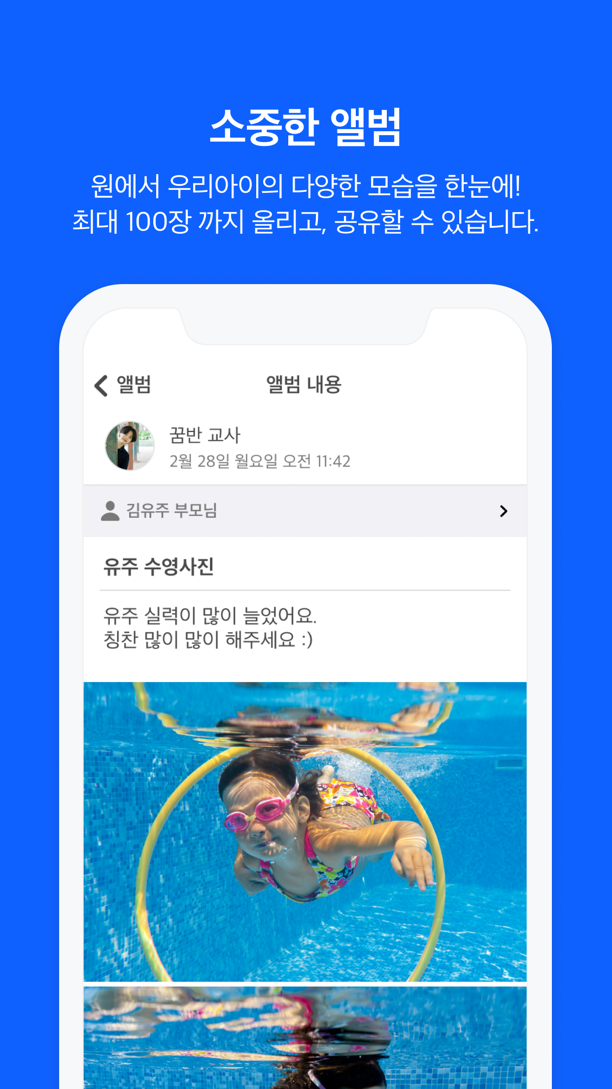 학원 수업이 어떻게 이루어지고 있는지 앨범 기능을 활용해 생생하게 전달해 보세요.