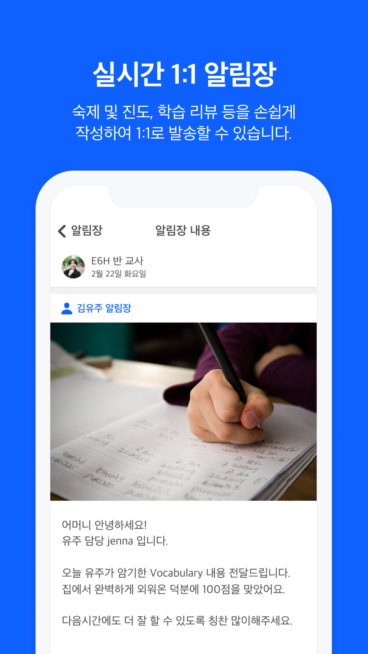 알림장 기능으로 개별 학생에 대한 개별 코멘트가 가능하기 때문에, 학부모와의 개별 소통이 가능한 학원 앱을 찾으시는 원장님들에게 꼭 필요한 기능입니다.