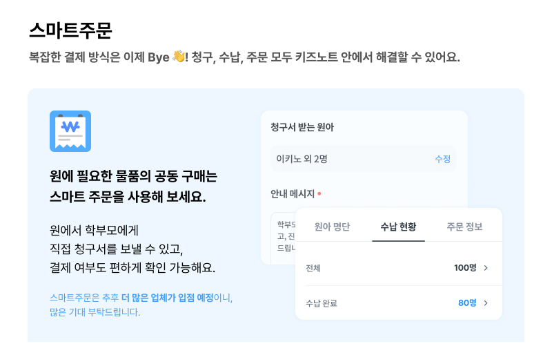 청구, 수납, 주문 모두 키즈노트 안에서 해결해요