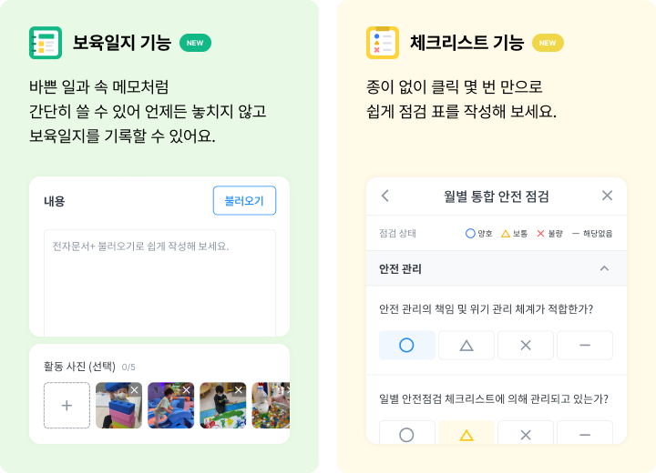 전자문서+ 의 보육일지, 체크리스트 기능이 새롭게 오픈되었어요.