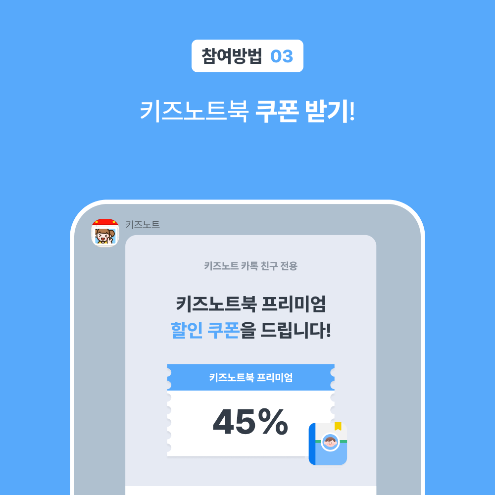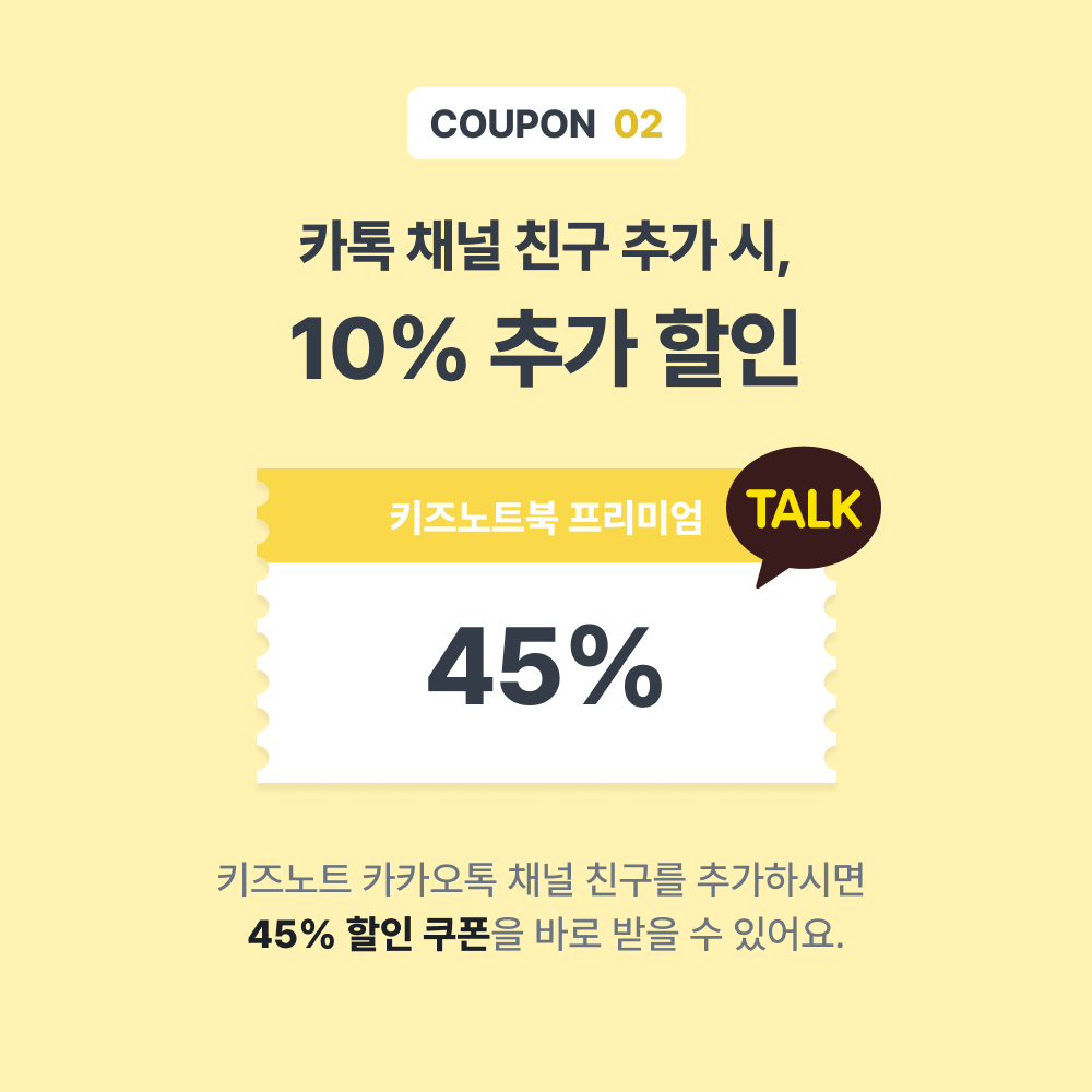 2️⃣ 키즈노트 카카오톡 채널 친구 추가 시, 10% 추가 할인을 더해서 45% 할인쿠폰을 드립니다!