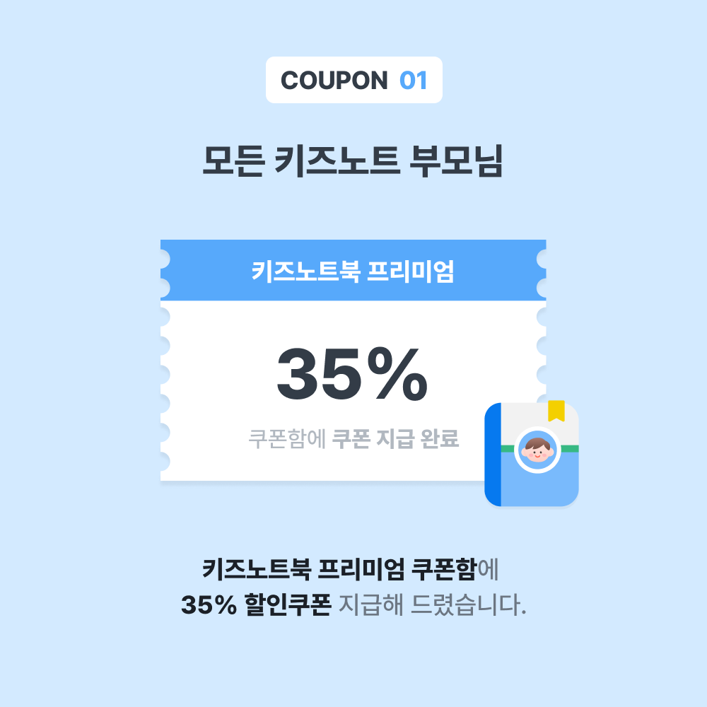 👉 쿠폰함에 미리 지급해 드렸습니다. 키즈노트 APP 쿠폰함에서 확인해 주세요.