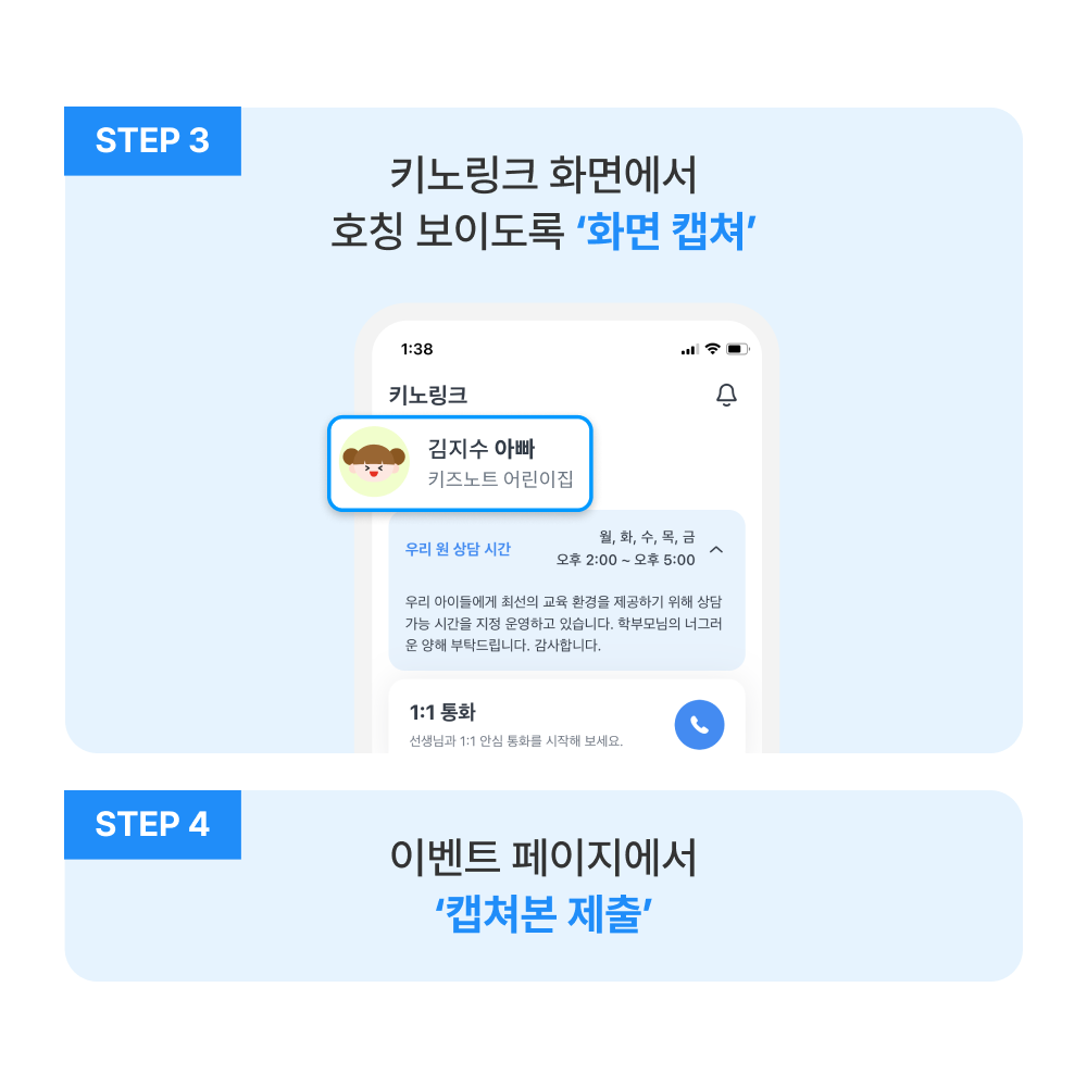 ✅ 이벤트 내용 : 키즈노트 ID를 아빠에게 공유하고, 아빠가 로그인하고 키노링크 화면 캡처하면 완료!