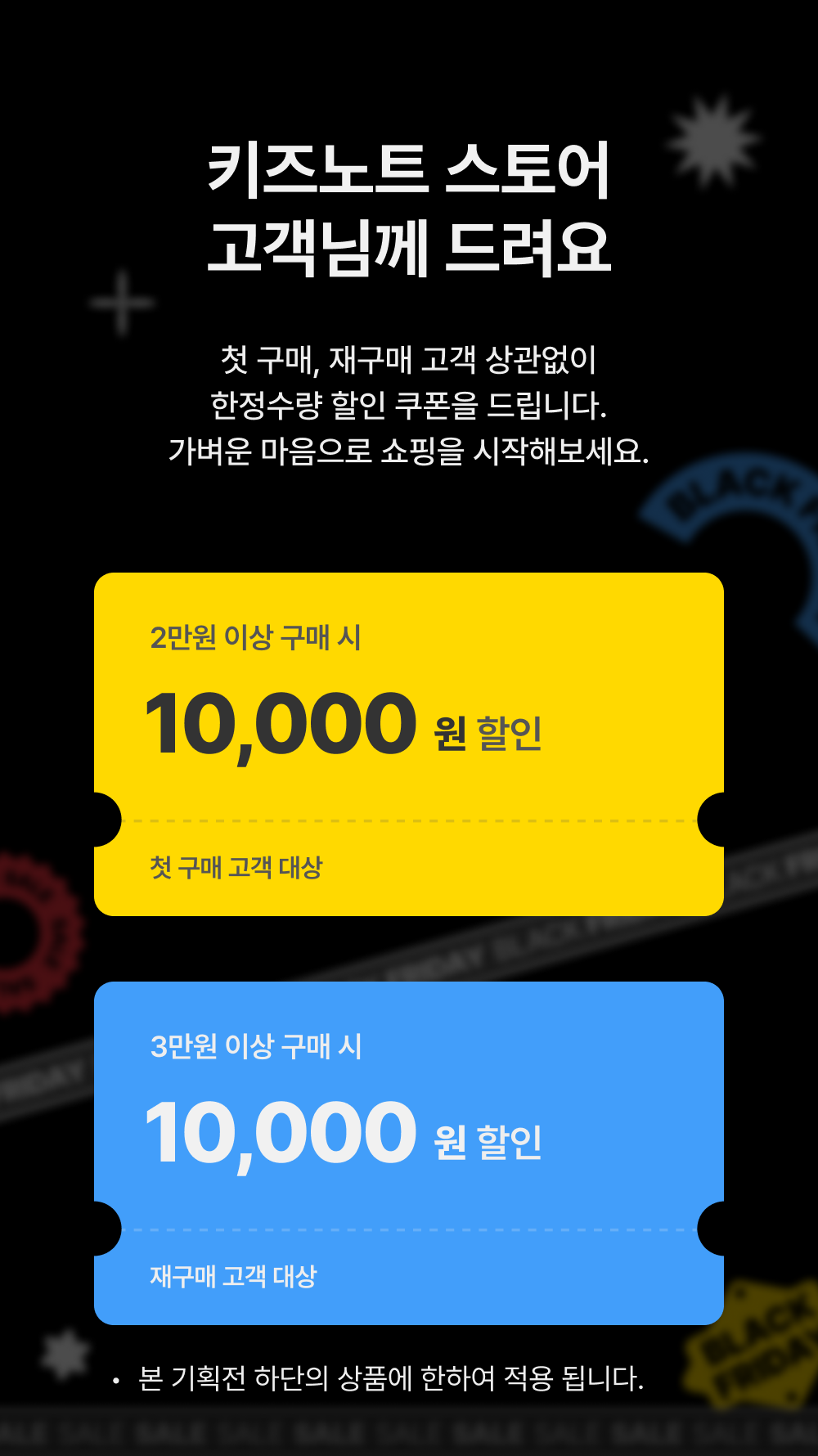 - 첫구매, 재구매 고객 상관없이 1만원 할인쿠폰 증정!
