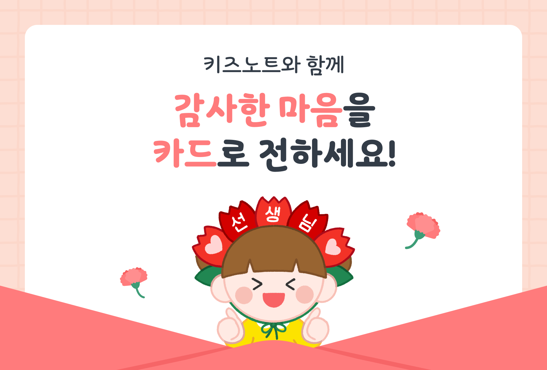 선생님께 감사의 마음이 잘 전해질 수 있게, 키즈노트가 감사 카드를 준비했어요.