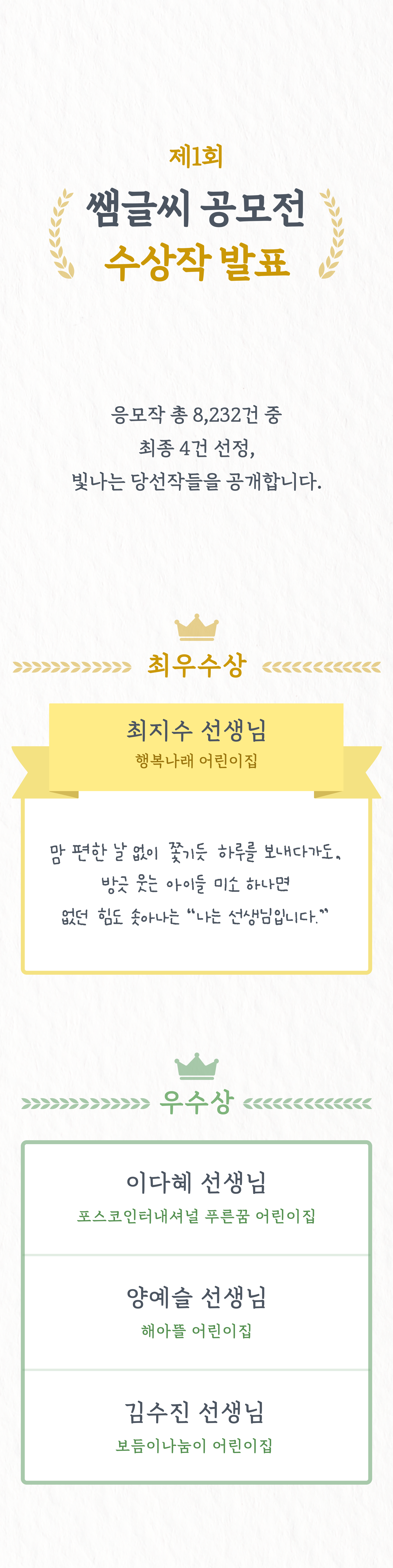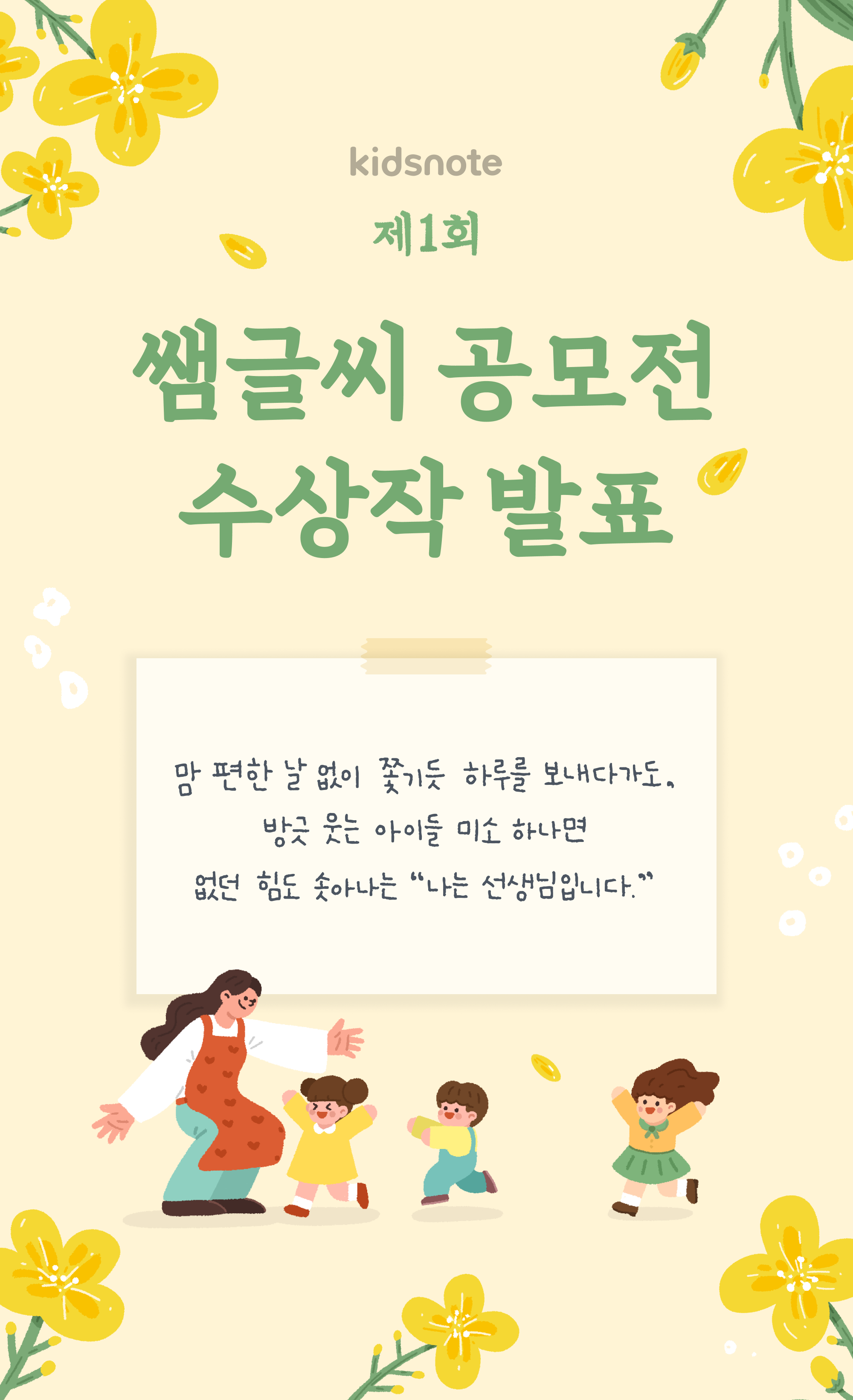 | [키즈노트] 스승의날 기념 제 1회 쌤글씨 공모전 개최 (0) | 2024.04.09 |