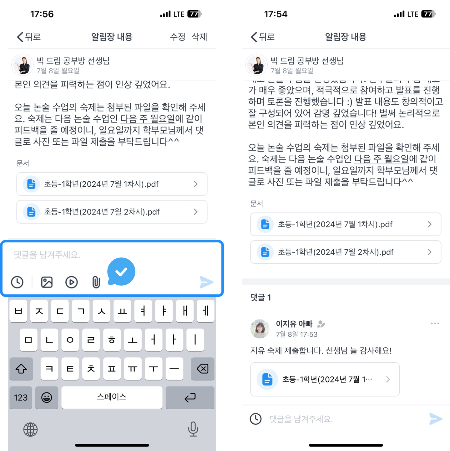 학생들은 댓글로 숙제를 제출할 수 있어